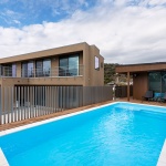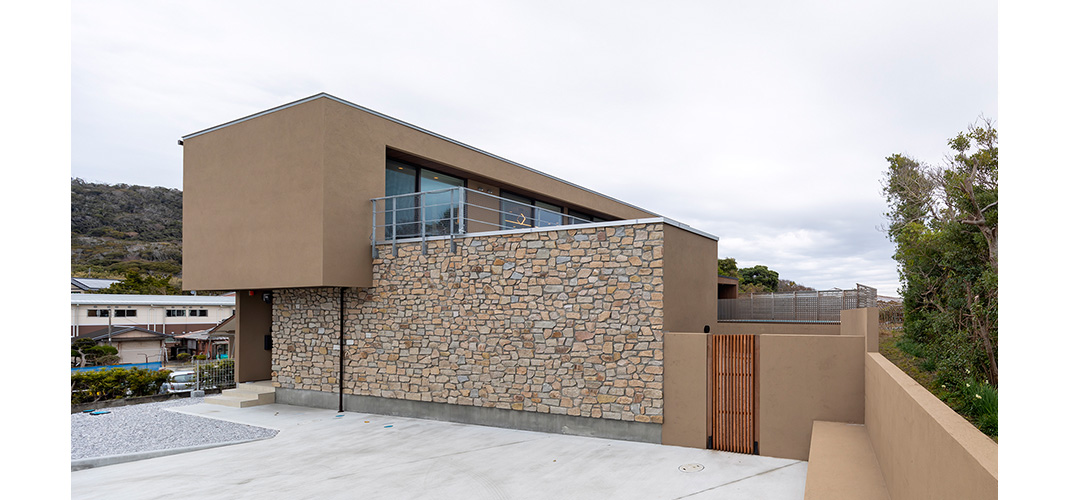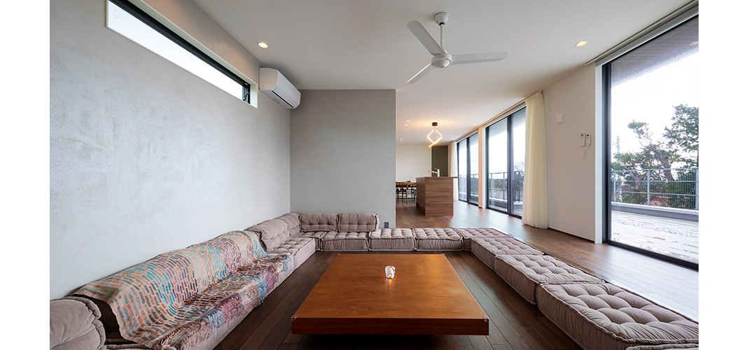 房総半島の最南端。漁師町の細い道を入っていった先。 すぐ目の前が浜辺というロケーションに建てられた、週末のための別荘。 プールに小屋。深い軒の下のテラス空間。内装は奥様のプロデュース。 別荘という事もあり、住宅と違って思い切った色使い、FARROW&BALLの塗料で仕上げました。 リビングはダウンフロアとし、視線を低くすることで、近景を隠して海・空と室内空間がつながる眺望に。